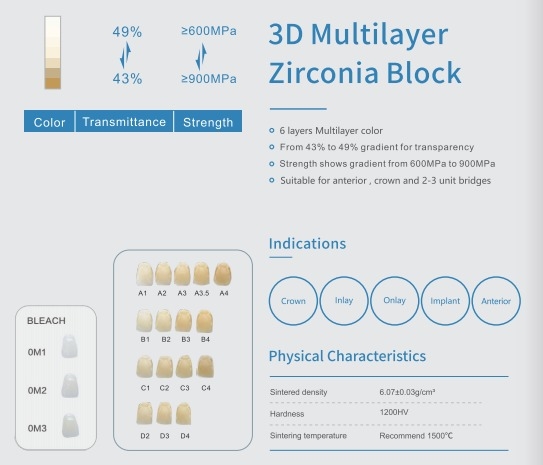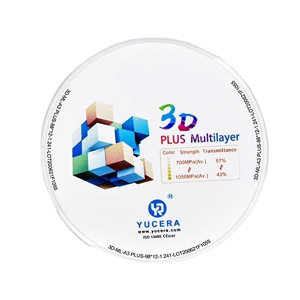 Yucera 3D Plus multilayer zirconia block represents the highest class of zirconia material, featuring natural color gradation (from dark to light), variable strength (1050MPa-700MPa), and controlled translucency (43%-57%) from cervical to incisal sections within a single block.