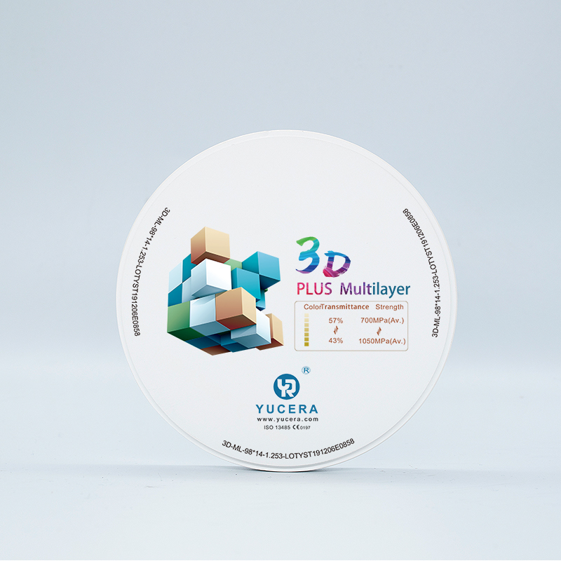 Yucera 3D plus multilayer zirconia block represents the highest class of dental zirconia material, featuring natural color gradation, variable strength, and controlled translucency throughout the block for superior aesthetic results.